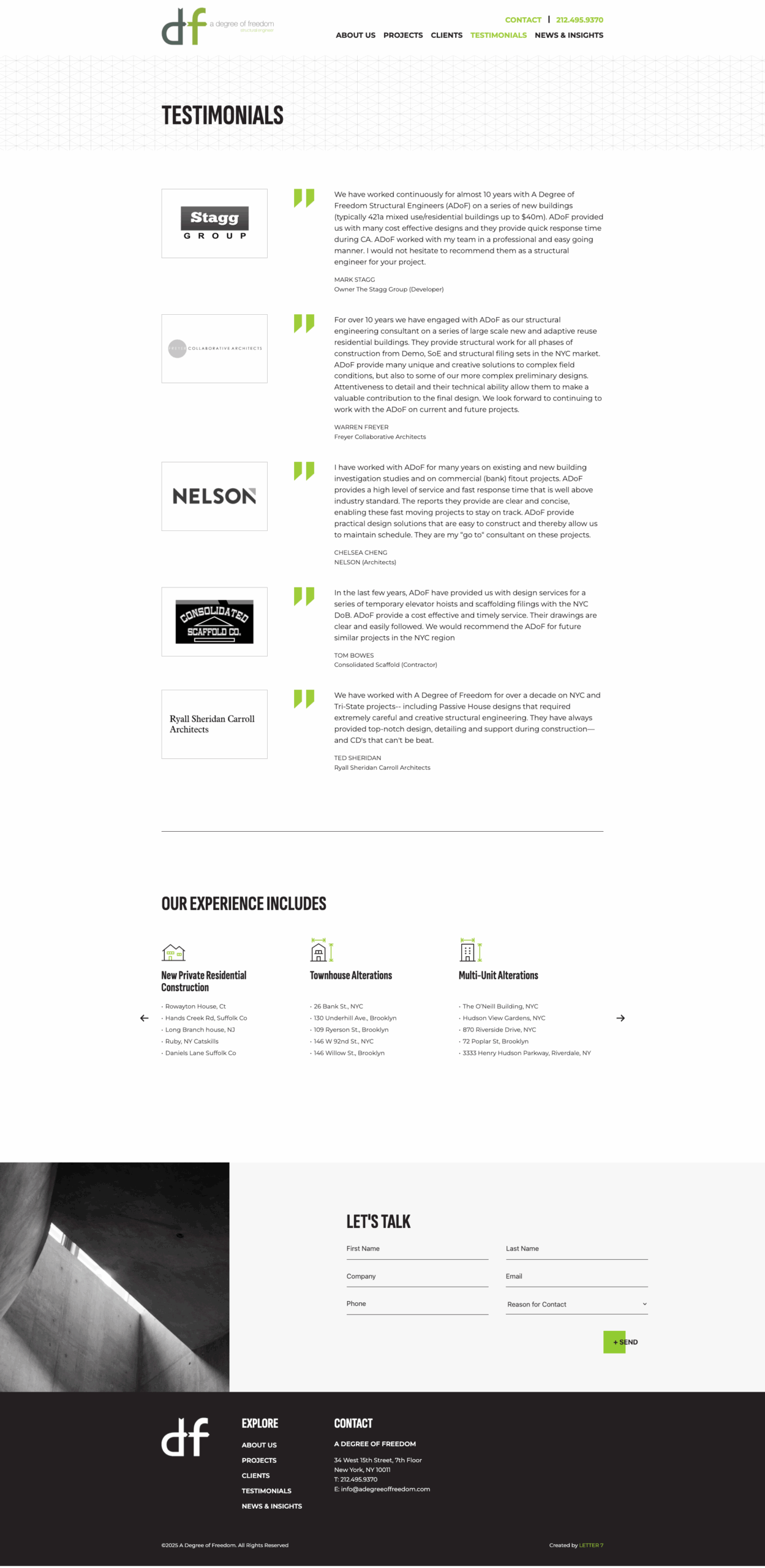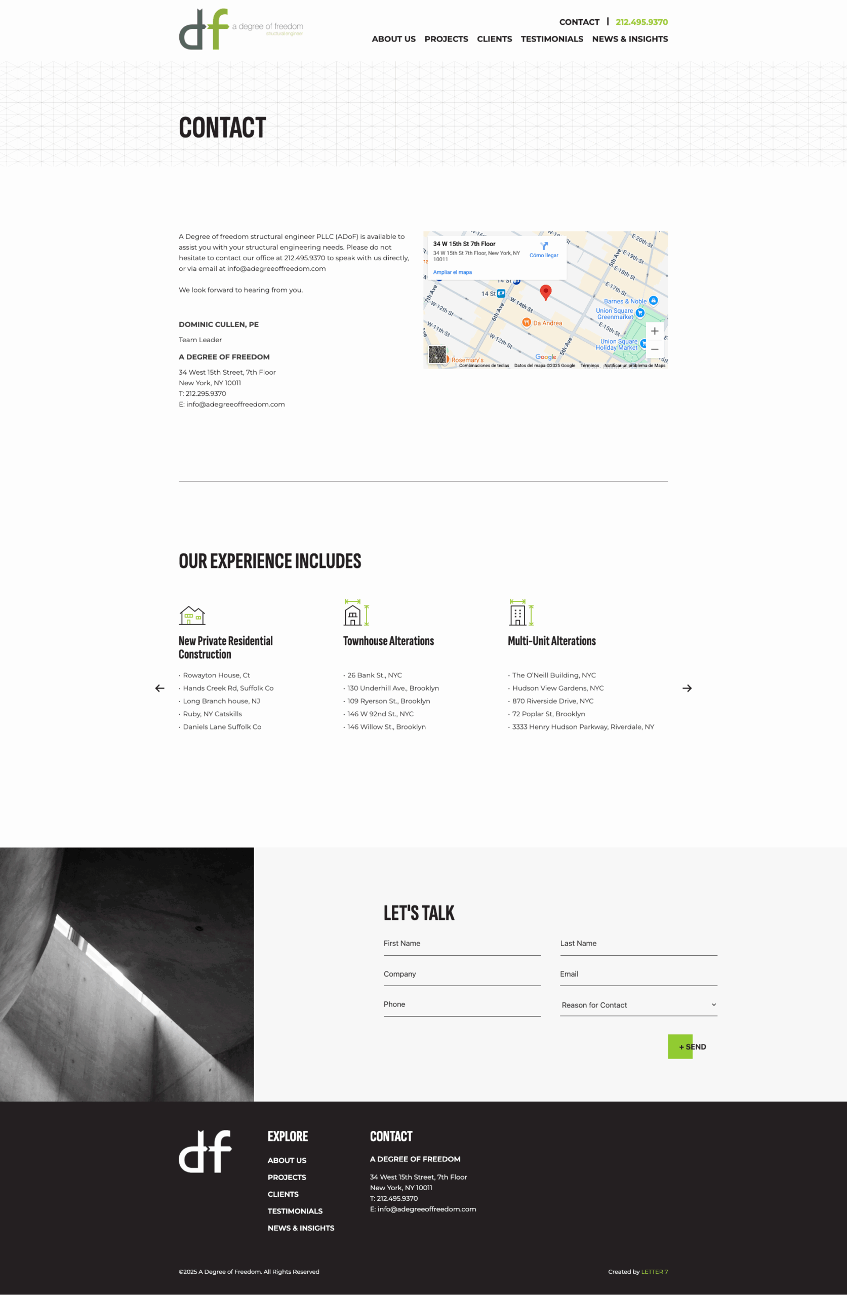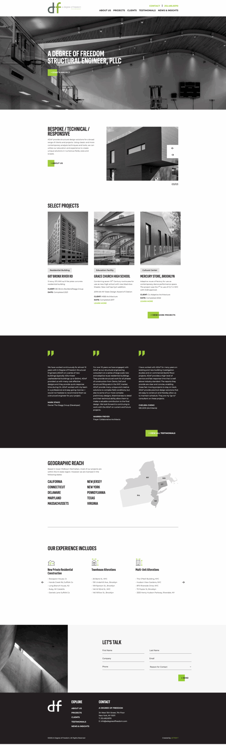 Sitio web institucional para A Degree of Freedom (ADoF), firma de ingeniería estructural con enfoque personalizado y sostenible, especializada en soluciones prácticas y eficientes para proyectos de diversa escala.