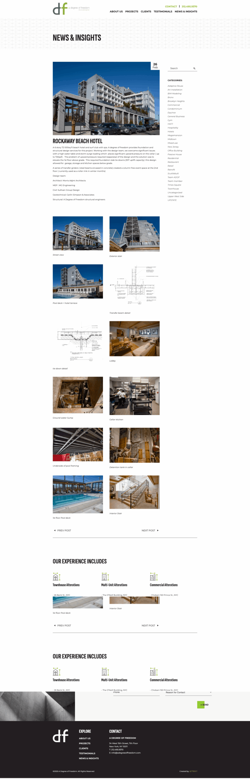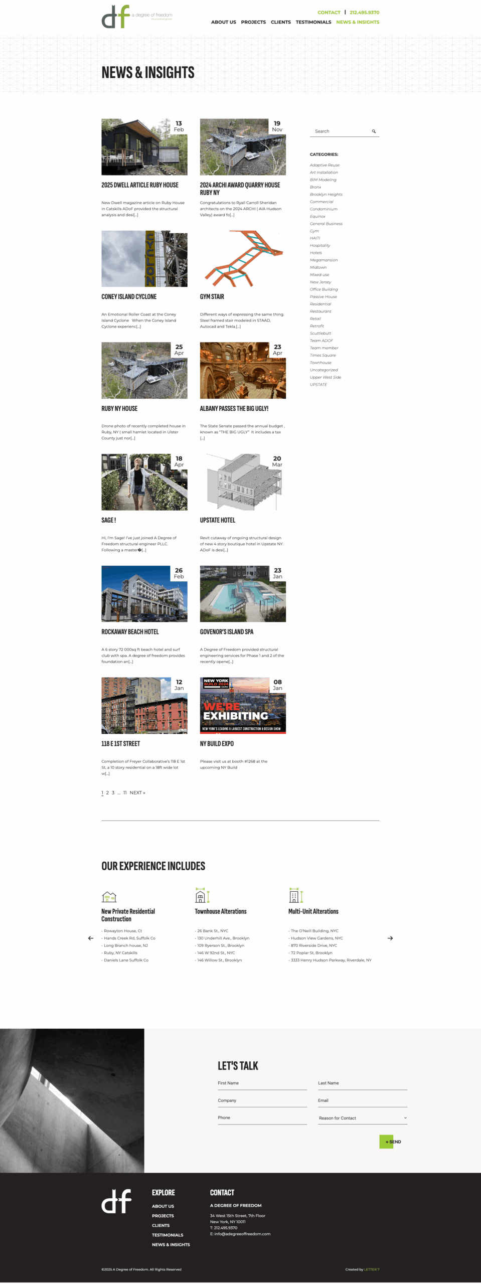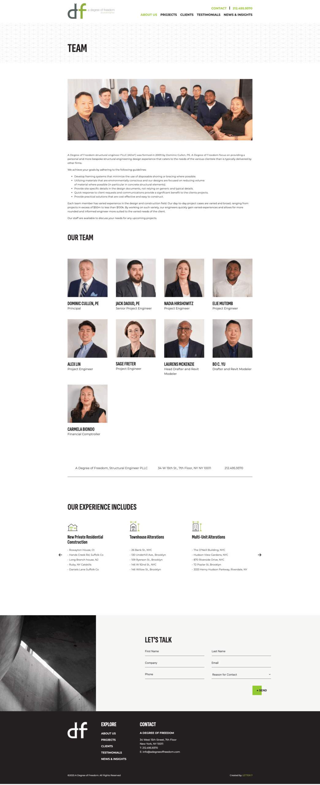 Sitio web institucional para A Degree of Freedom (ADoF), firma de ingeniería estructural con enfoque personalizado y sostenible, especializada en soluciones prácticas y eficientes para proyectos de diversa escala.