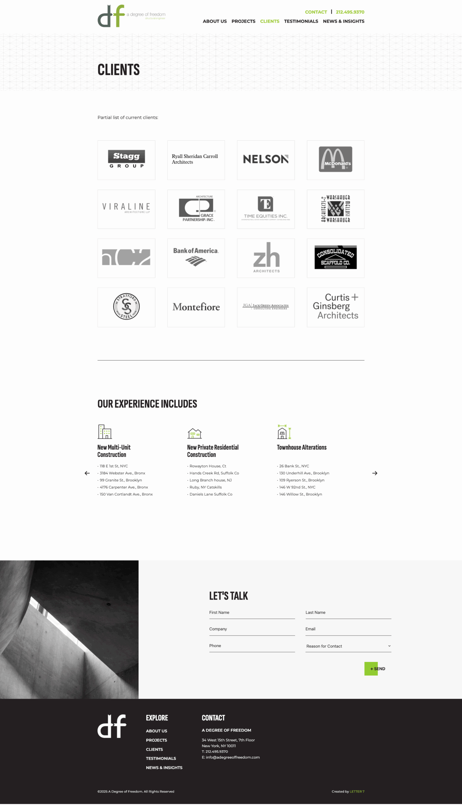 Desarrollé el frontend y backend del sitio a partir del diseño entregado, integrando un sistema de page builder que permite a los administradores editar contenido de manera flexible. Creé módulos personalizados para gestionar secciones clave como Projects, Clients, Testimonials y News & Insights, facilitando la actualización del contenido sin necesidad de intervención técnica. El enfoque del desarrollo fue entregar un sitio limpio, fácil de mantener y alineado con la imagen profesional de la firma.