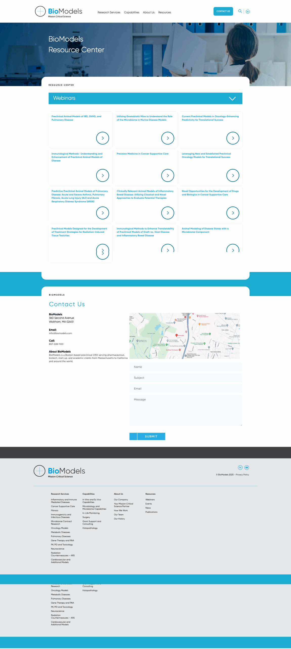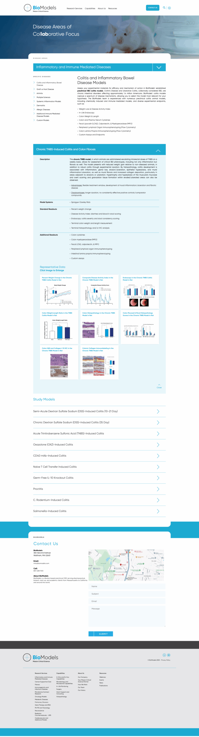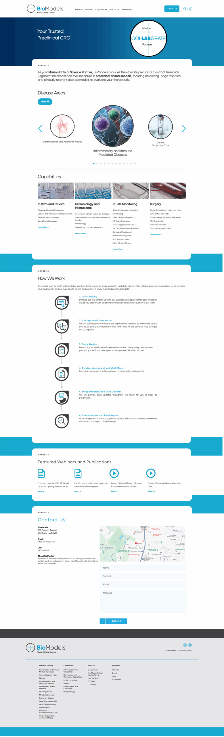 Sitio web corporativo para BioModels, empresa especializada en modelos preclínicos de investigación animal, enfocada en ofrecer servicios contractuales de investigación científica avanzada.