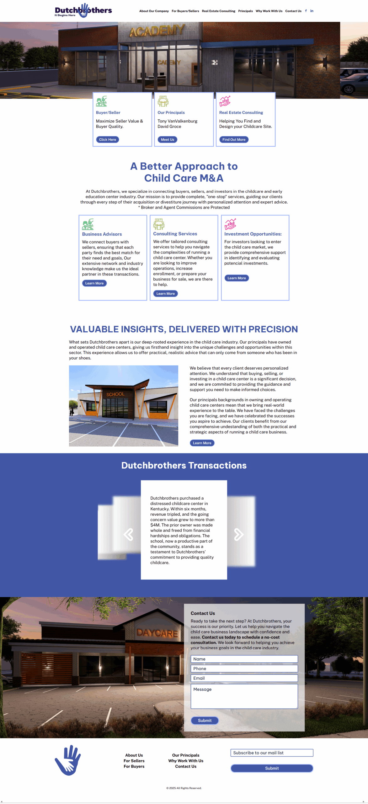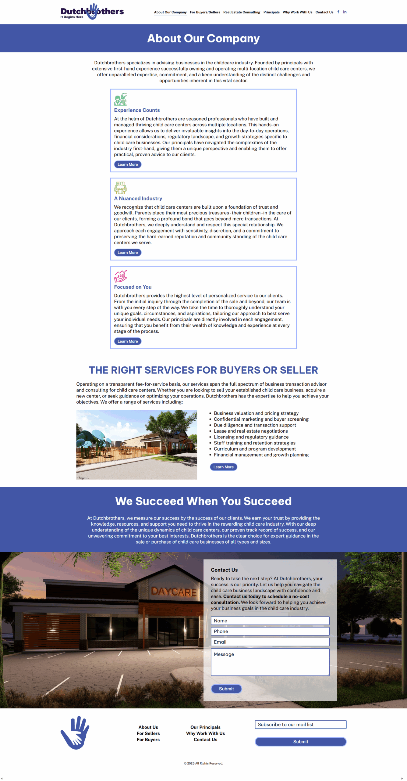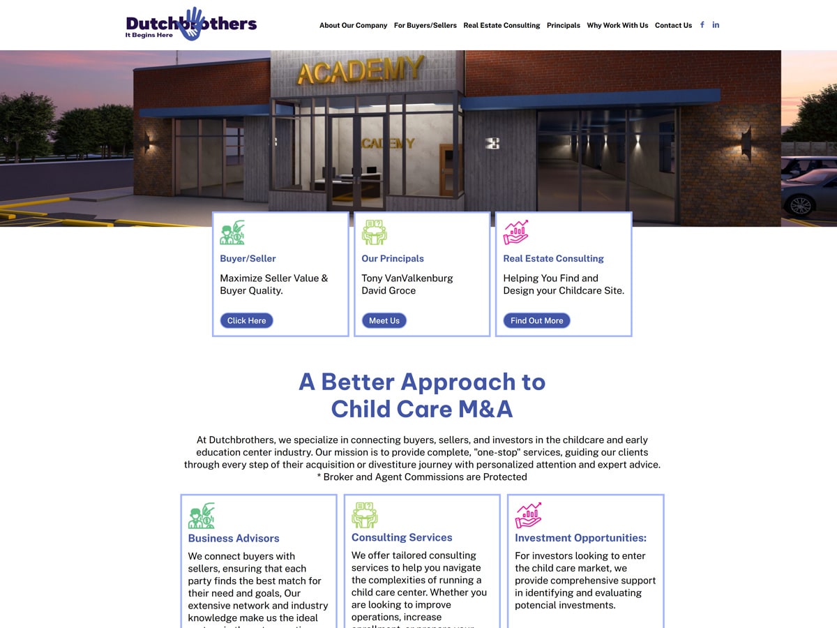 Sitio web autoadministrable desarrollado para Dutch Brothers Partners, empresa especializada en conectar compradores, vendedores e inversionistas dentro de la industria de centros de cuidado infantil y educación temprana en EE.UU.