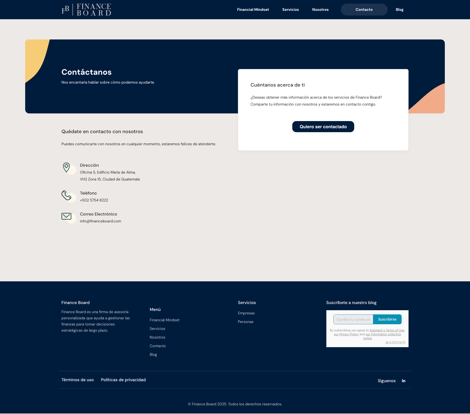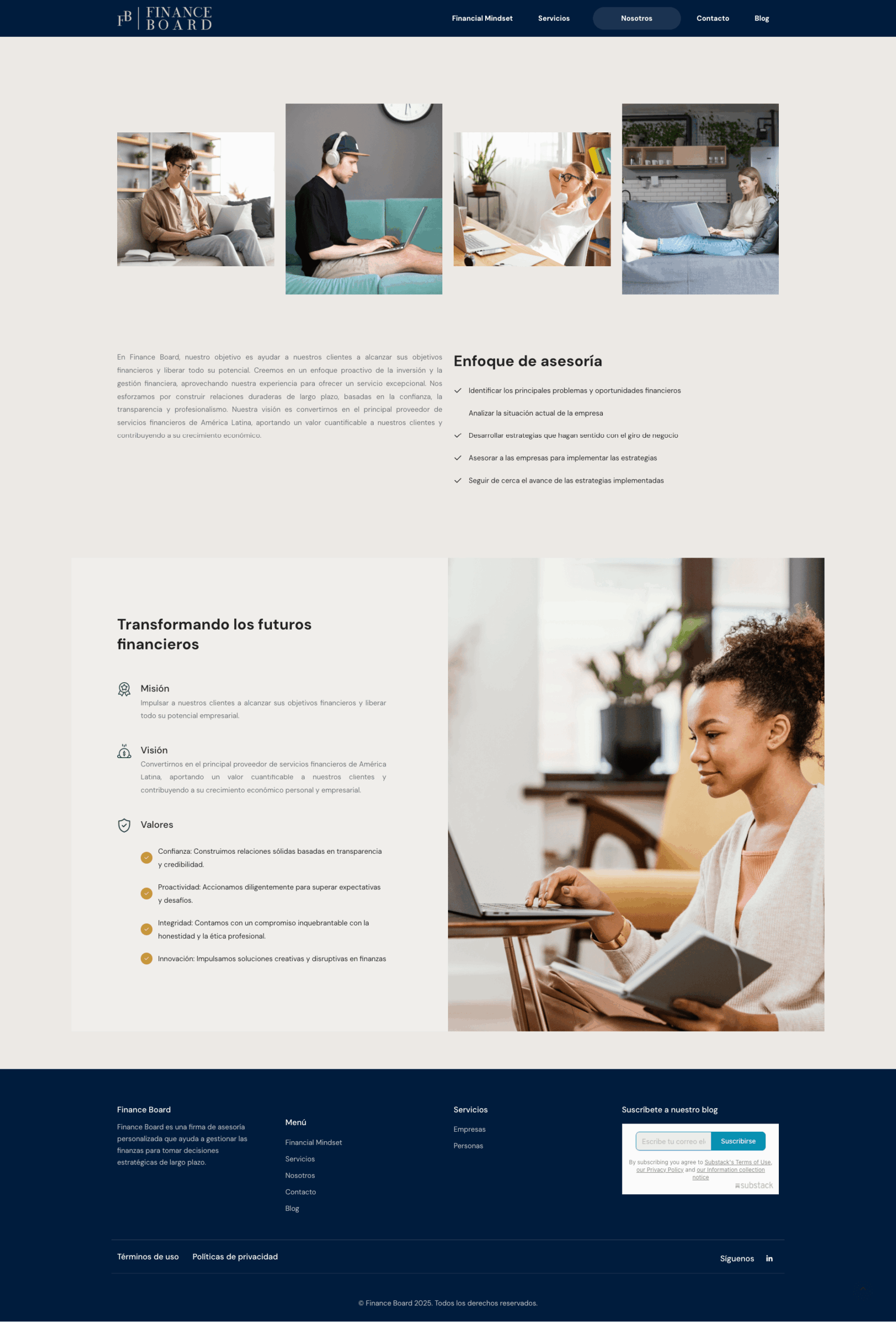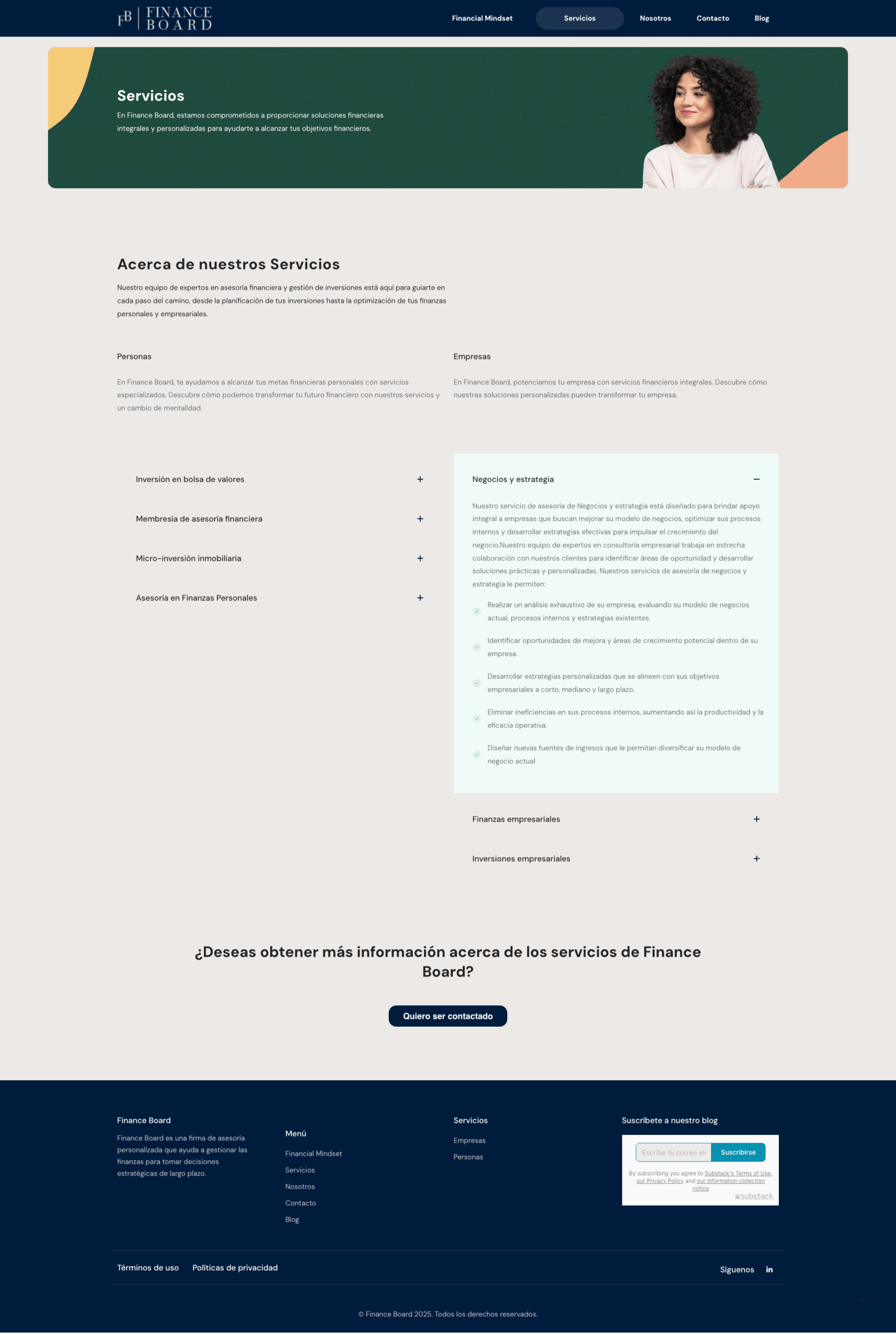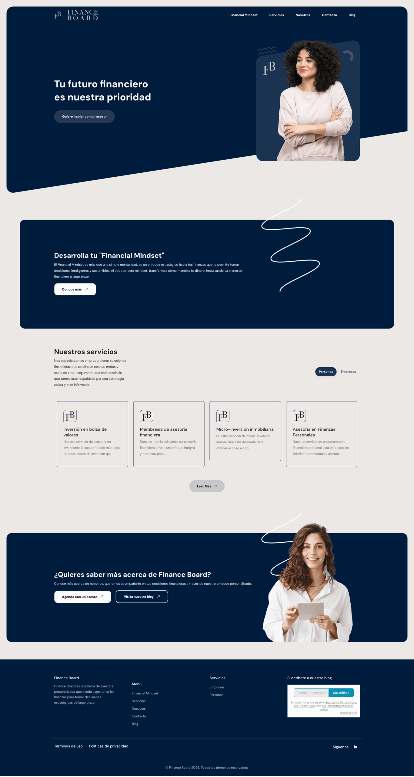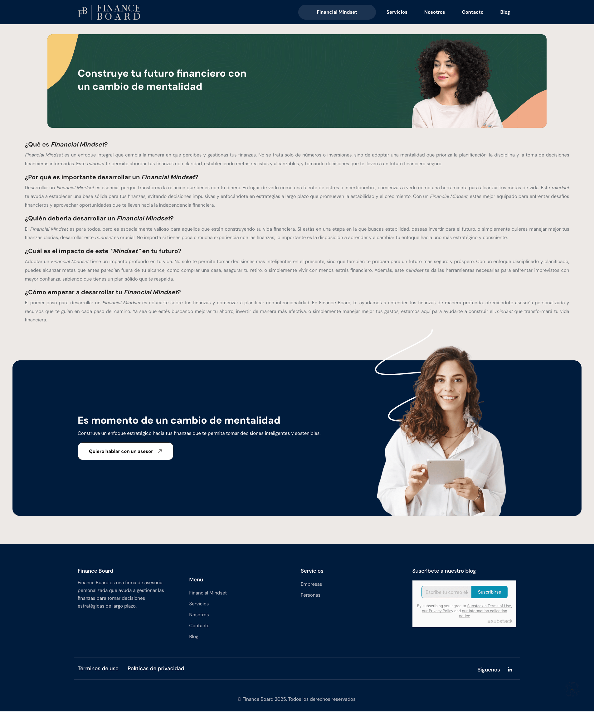 Sitio web informativo para Finance Board, enfocado en educar y asesorar a personas interesadas en desarrollar una mentalidad financiera sólida (Financial Mindset) mediante contenido estructurado, claro y accesible.