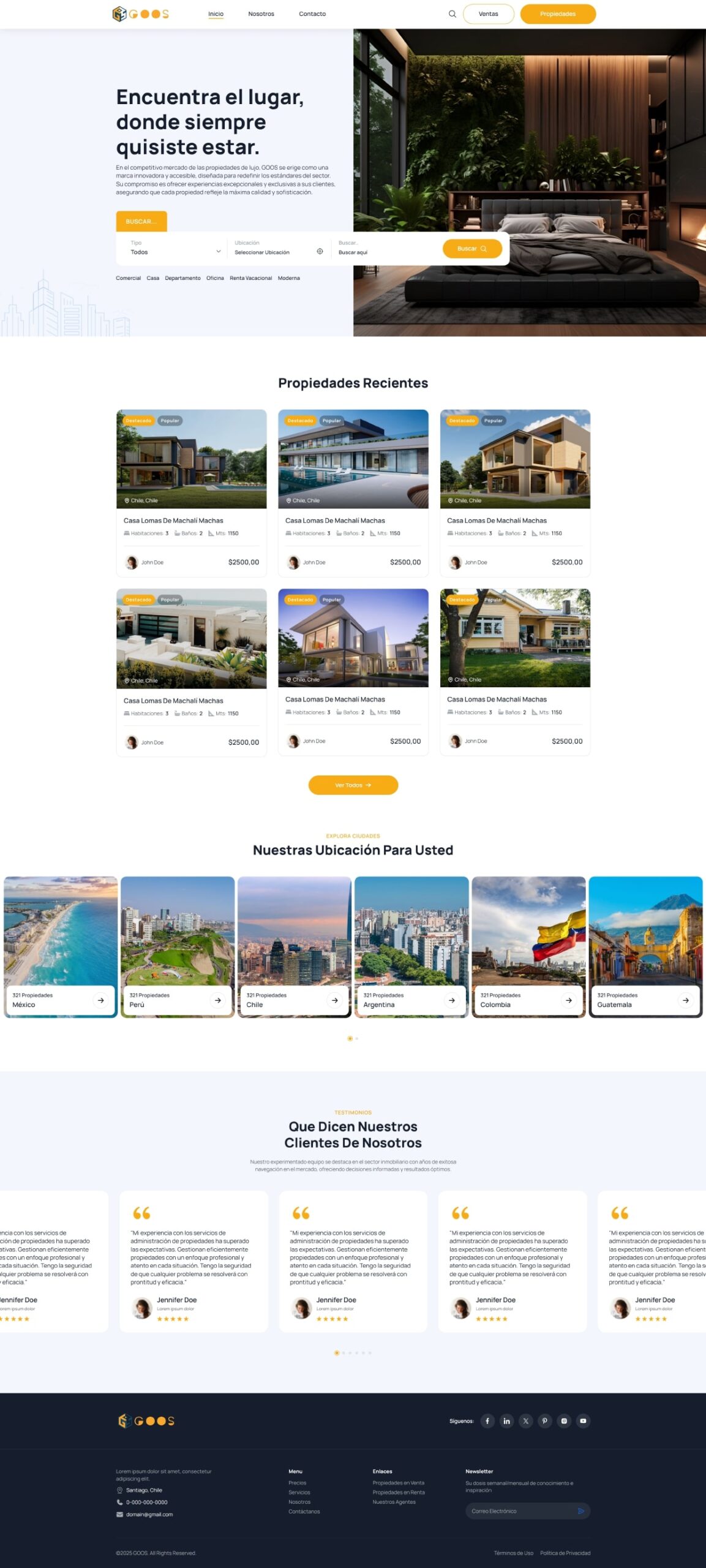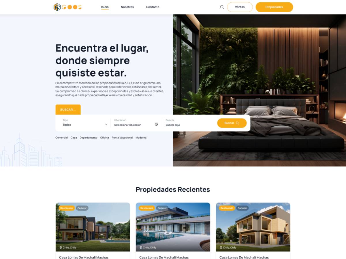 Sitio web para Goos Inmobiliaria, diseñado para la publicación y búsqueda de propiedades en venta o alquiler, con una interfaz clara y moderna para facilitar la navegación del usuario.