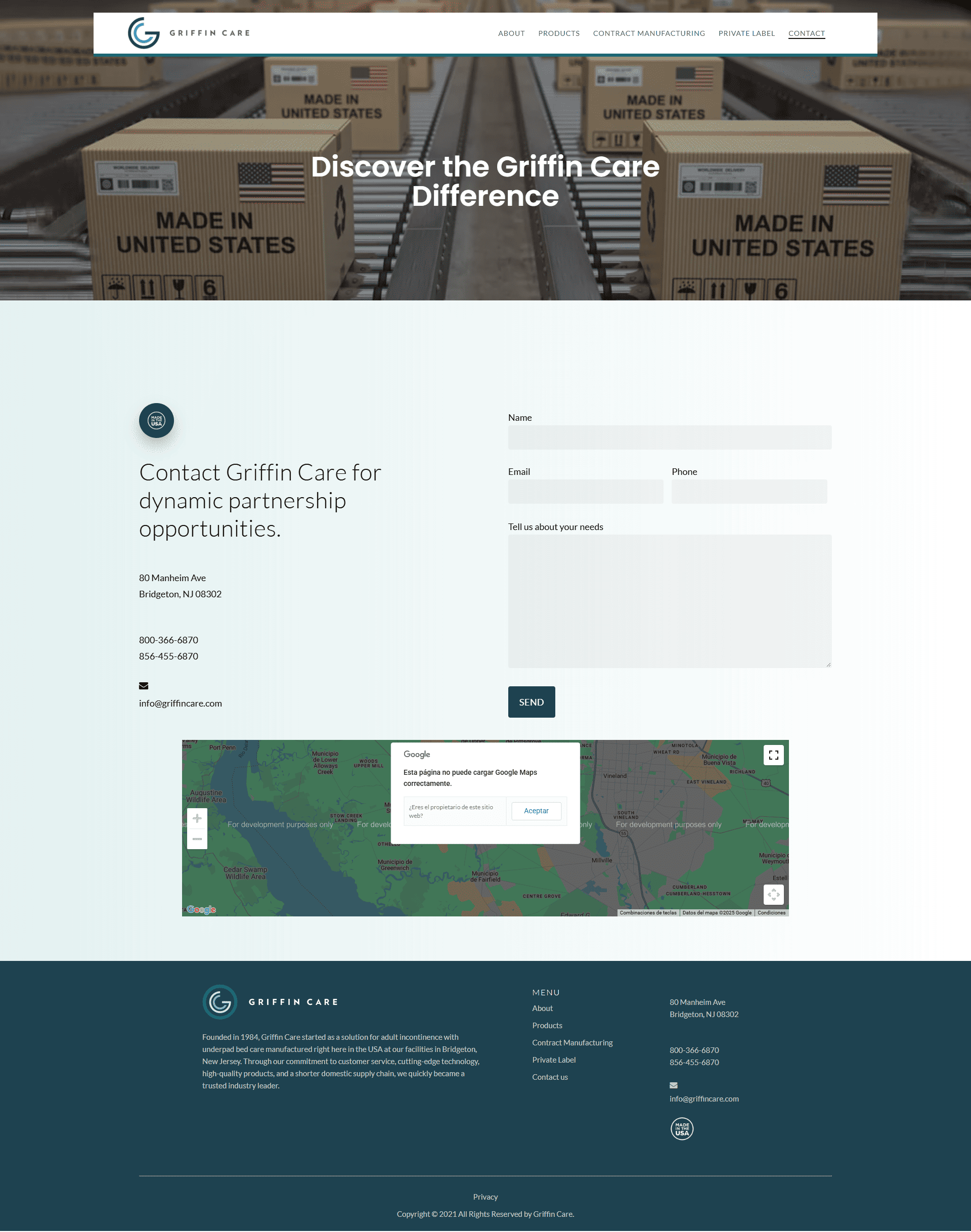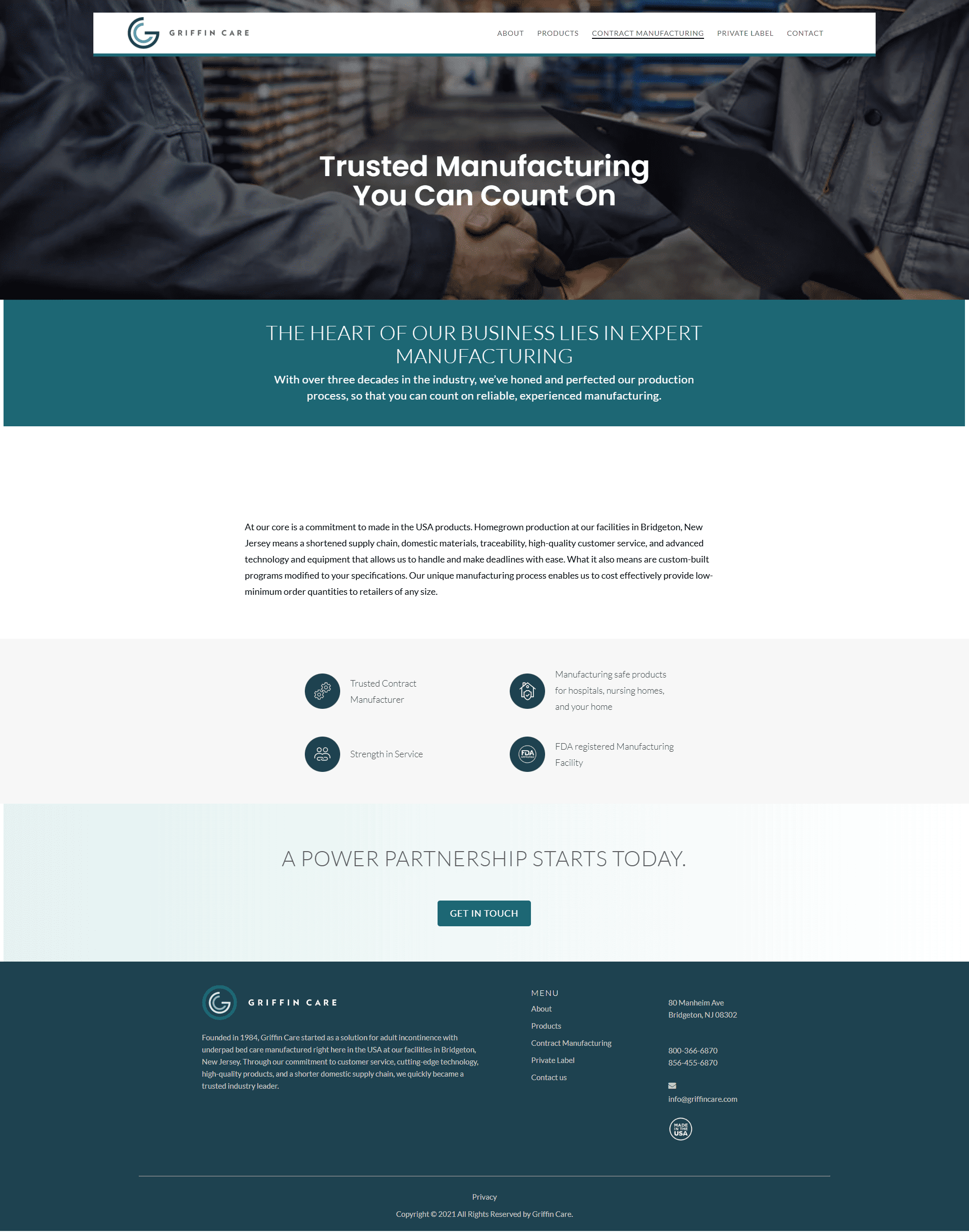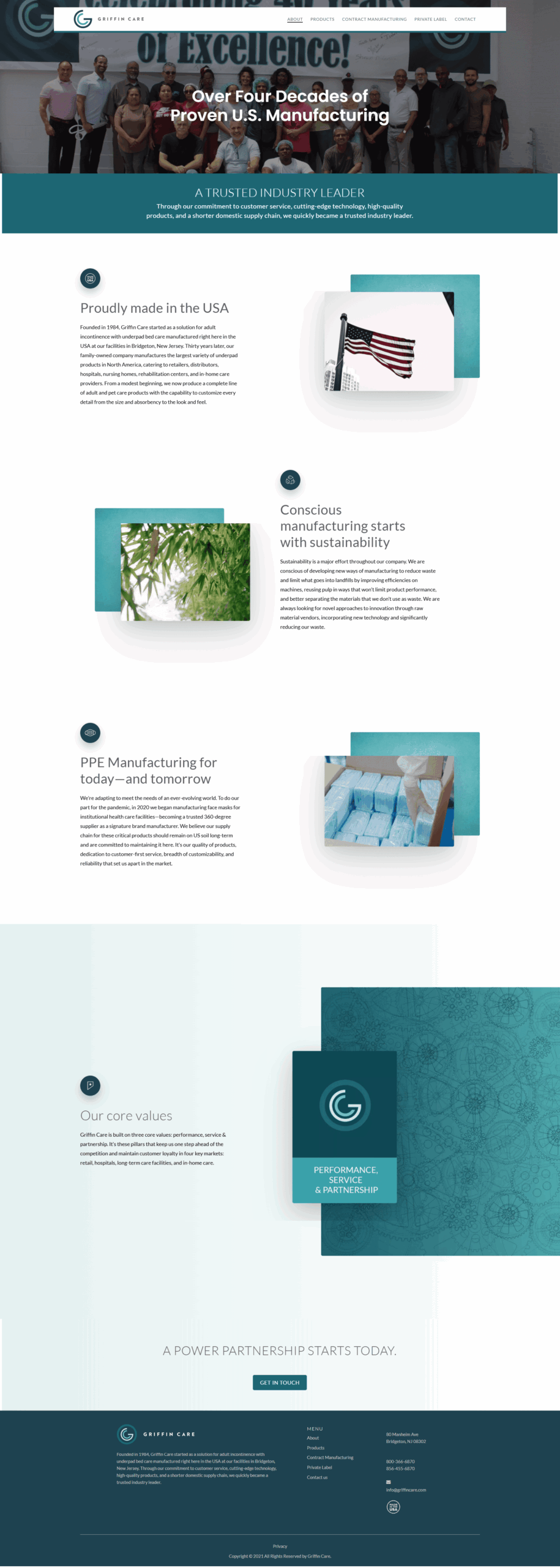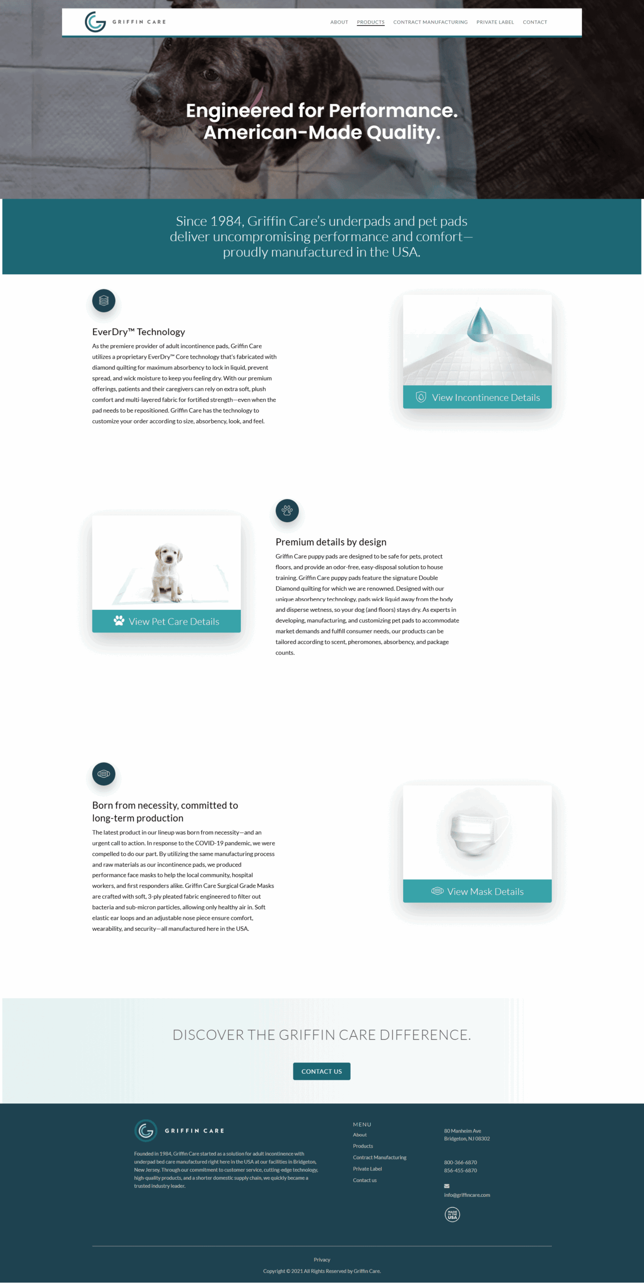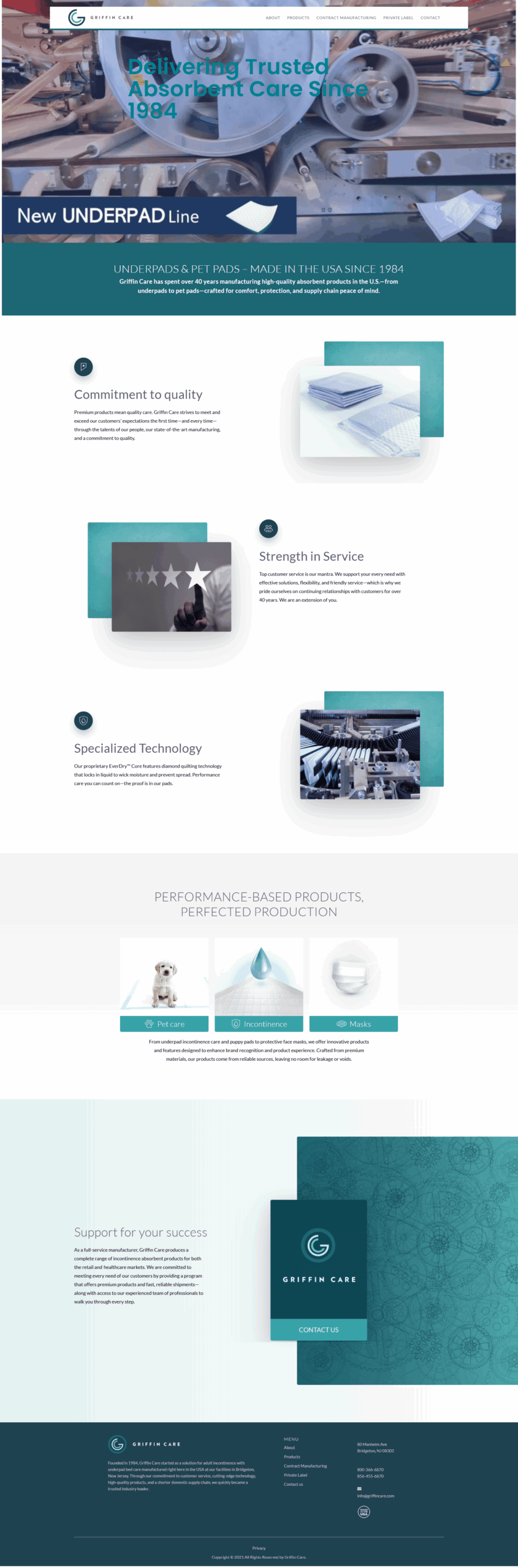 Sitio web autoadministrable desarrollado para Griffin Care, empresa familiar estadounidense con más de 30 años de experiencia en la fabricación de productos para el cuidado de adultos y mascotas, especializada en underpads y soluciones personalizadas para el sector salud y retail.