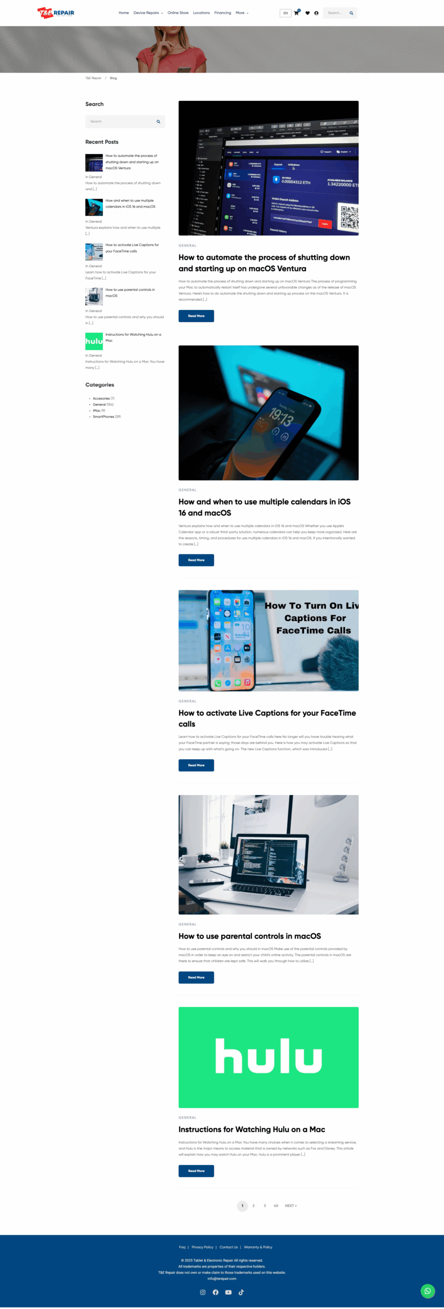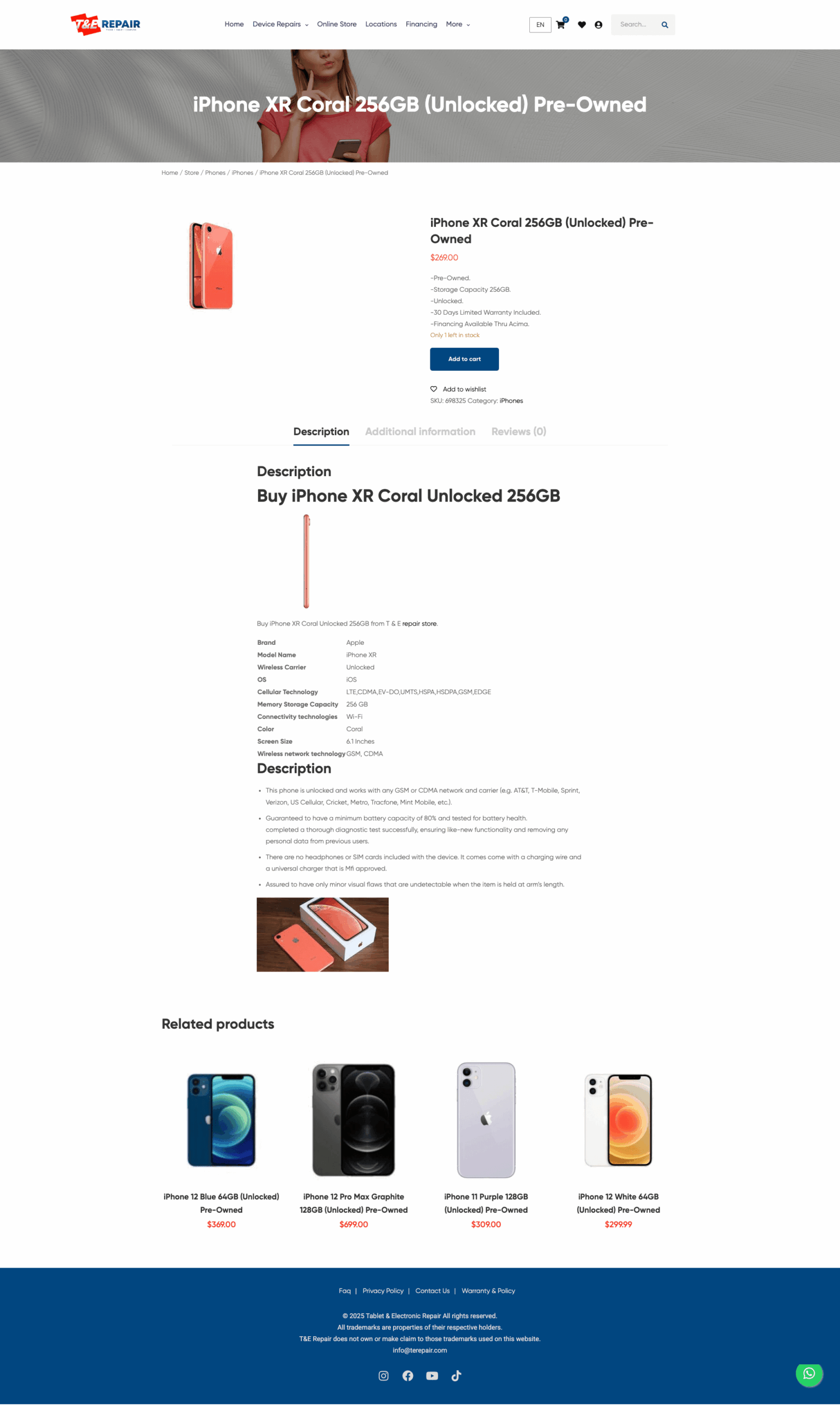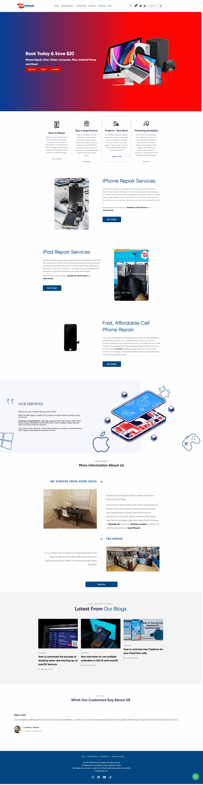 Sitio web informativo y tienda en línea para T&E Repair, empresa con tres sucursales físicas dedicadas a la reparación y venta de dispositivos electrónicos reacondicionados (celulares, tablets, computadoras y consolas de videojuegos).