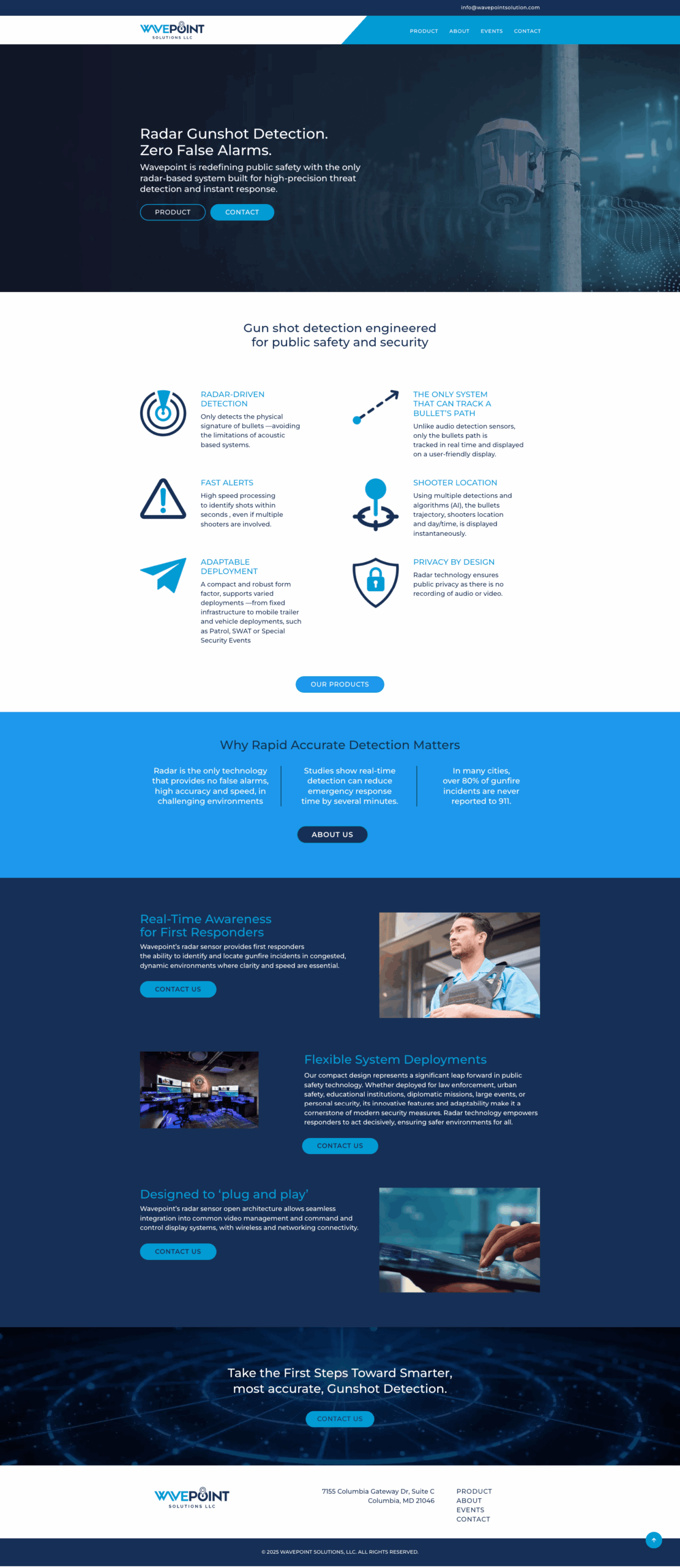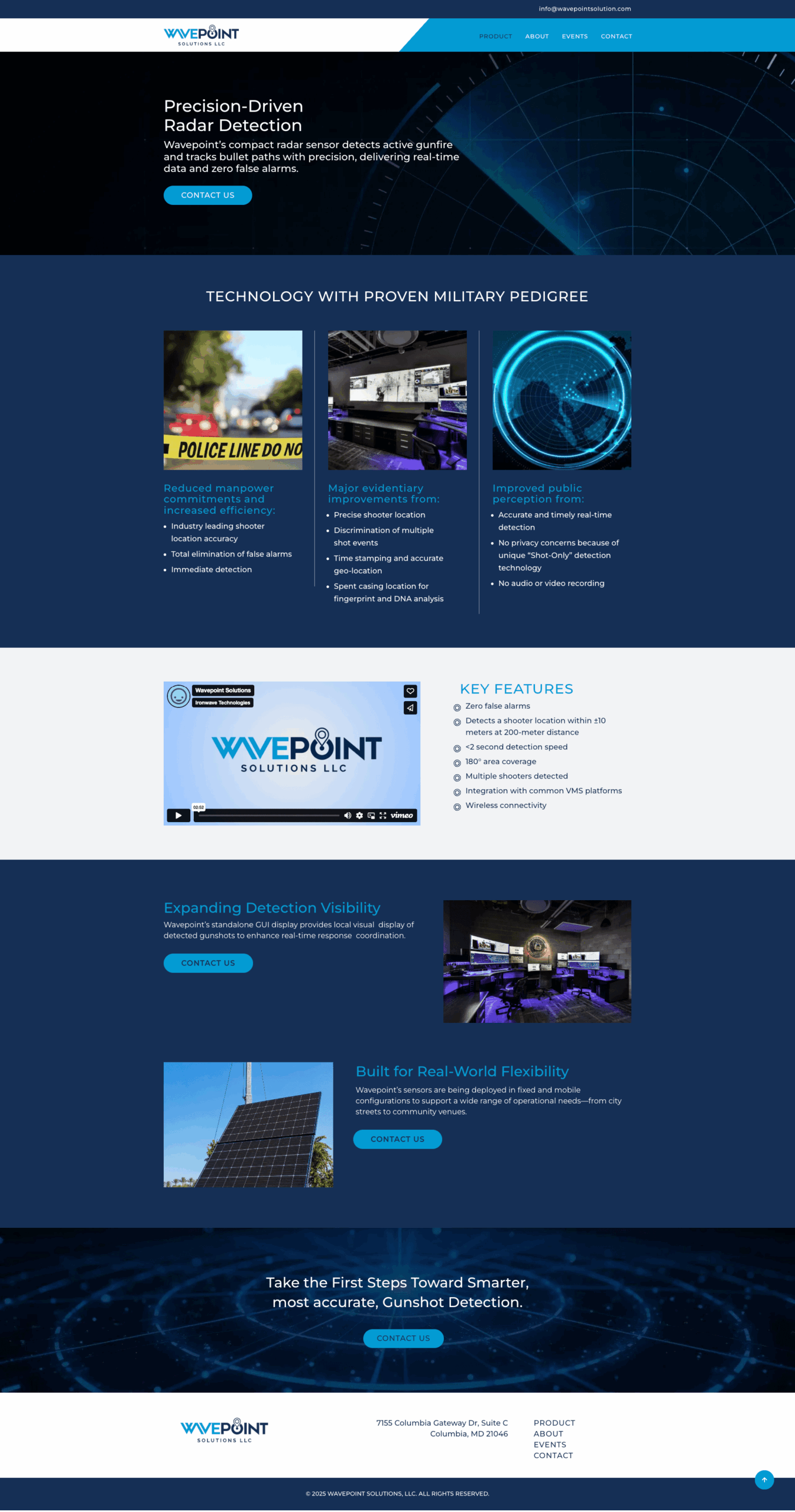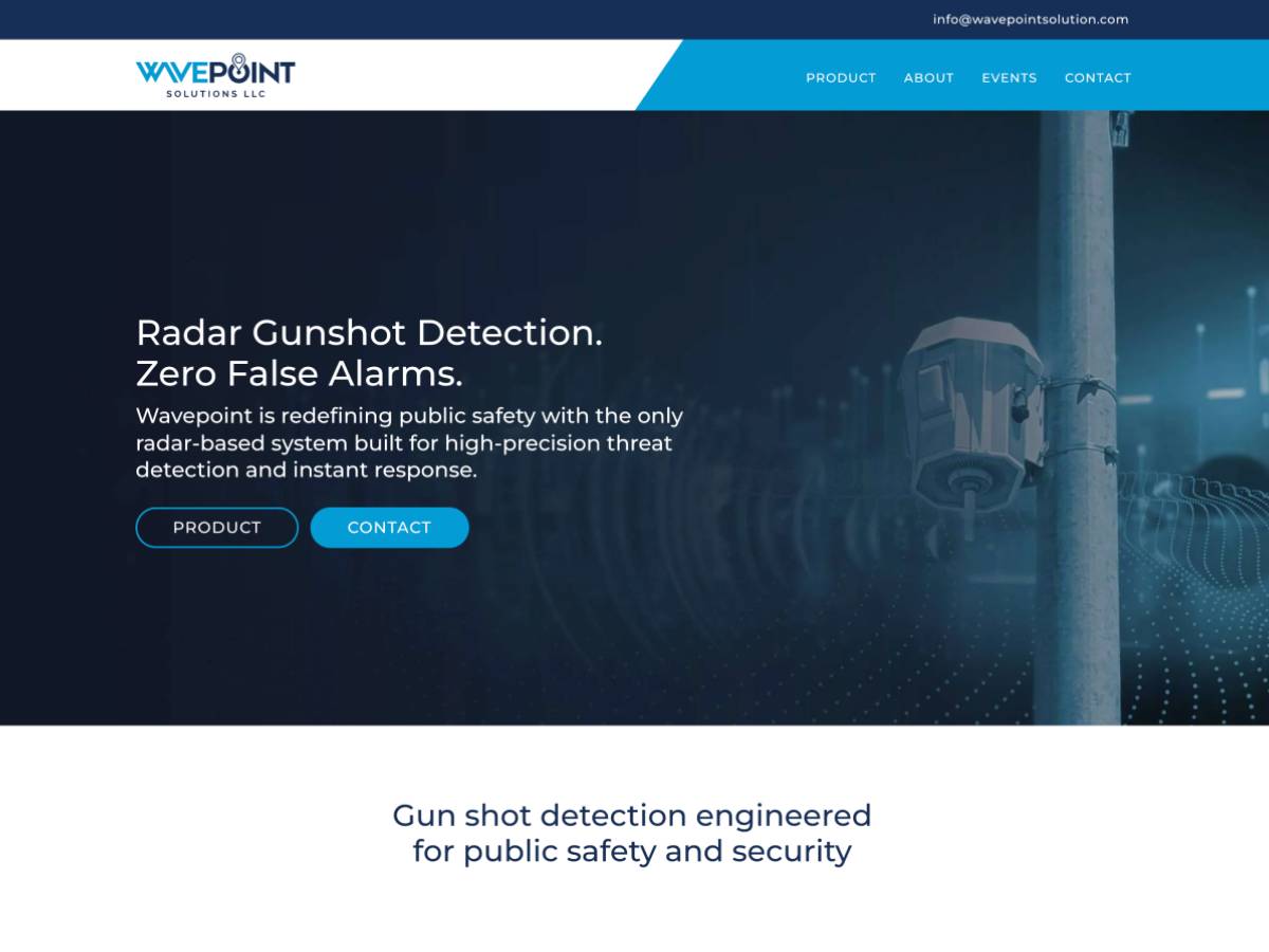 Sitio web informativo para Wavepoint Solutions, empresa especializada en tecnología de detección de disparos mediante radar, con soluciones desarrolladas originalmente para el ejército de EE.UU. y adaptadas para su uso en contextos civiles y de respuesta inmediata.