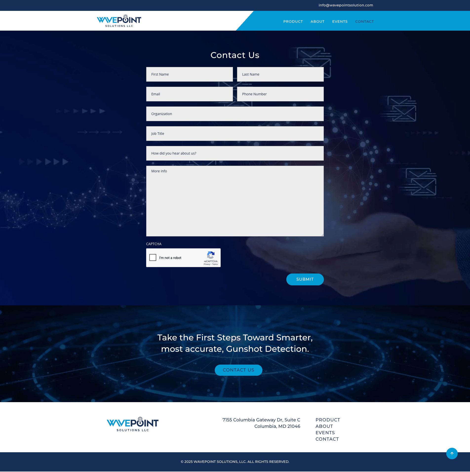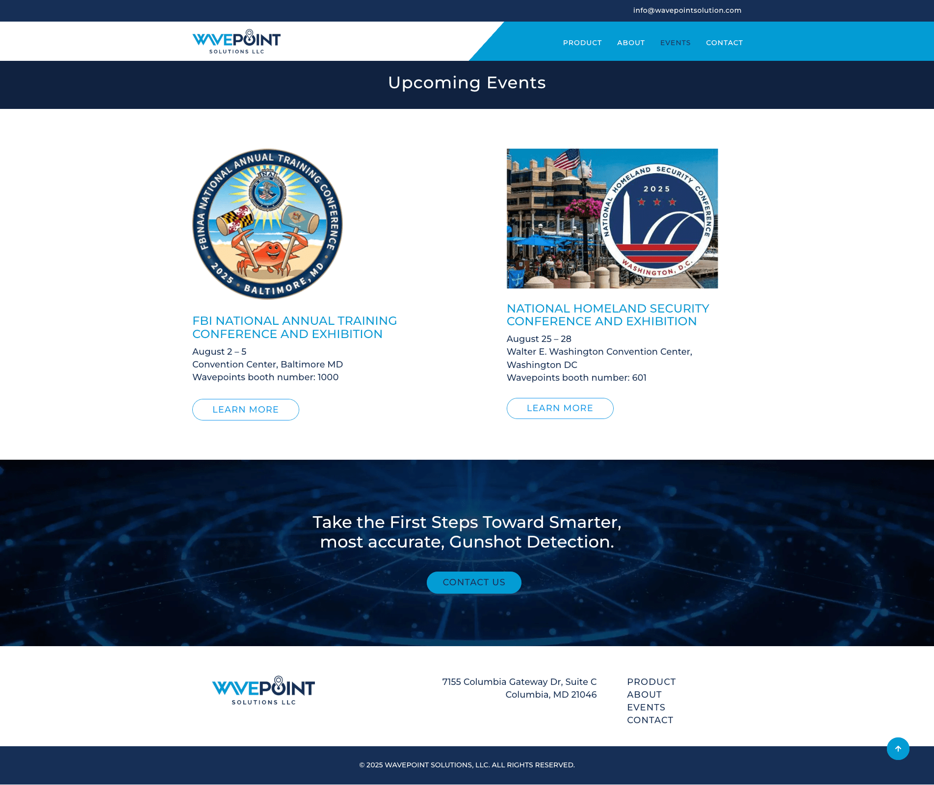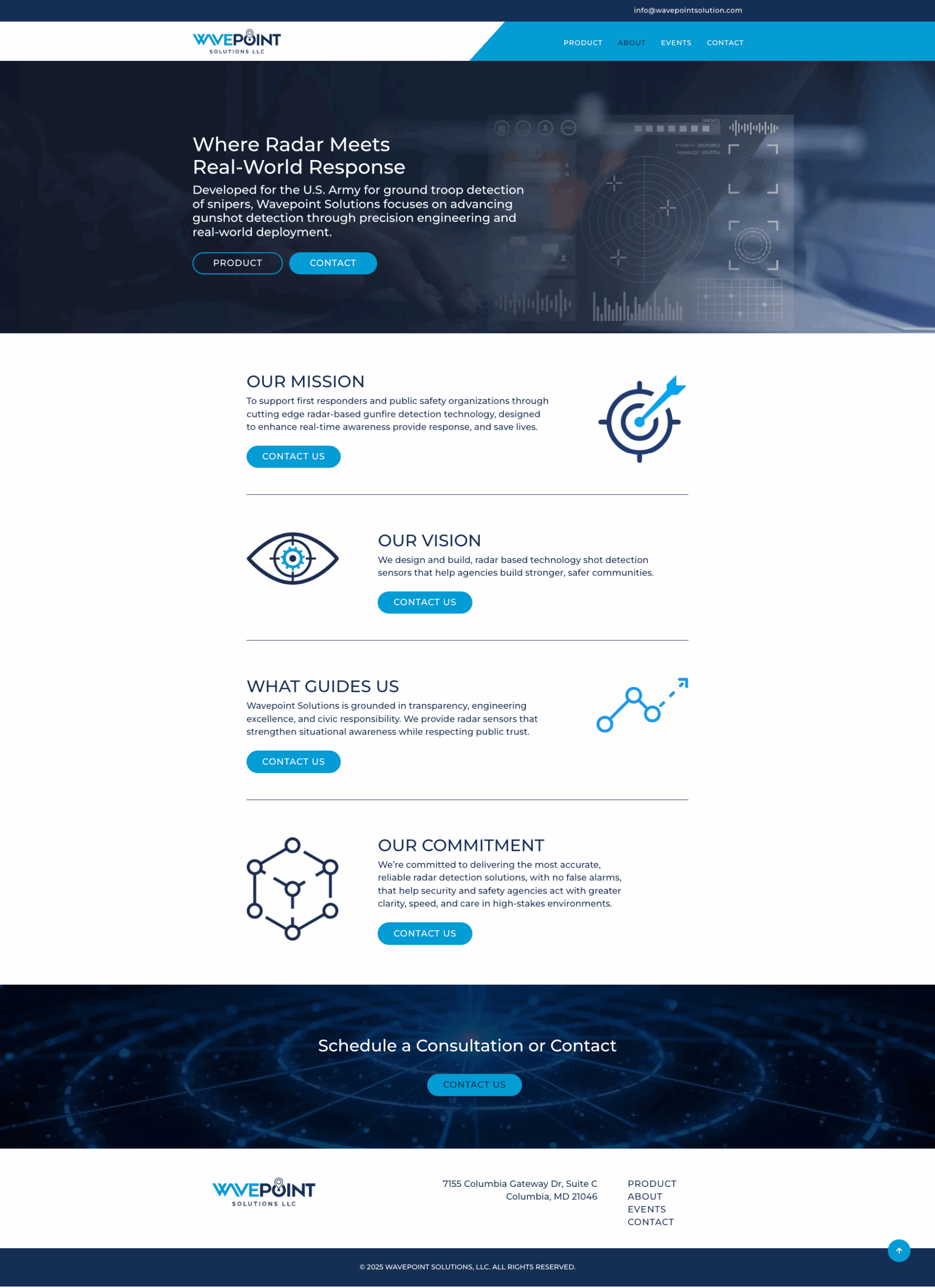 Sitio web informativo para Wavepoint Solutions, empresa especializada en tecnología de detección de disparos mediante radar, con soluciones desarrolladas originalmente para el ejército de EE.UU. y adaptadas para su uso en contextos civiles y de respuesta inmediata.